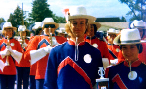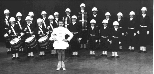 Each member of the drum section owned his own snare drum and Fred provided a bass drum and cymbals. A very small bugle section, directed by George, worked out on borrowed brass bugles. Uniforms were makeshift, appearances scattered, but enthusiasm and loyalty was contagious. A Parents’ Auxiliary was formed and through the efforts of this group the blue uniform with white accessories was established and an emblem was designed.