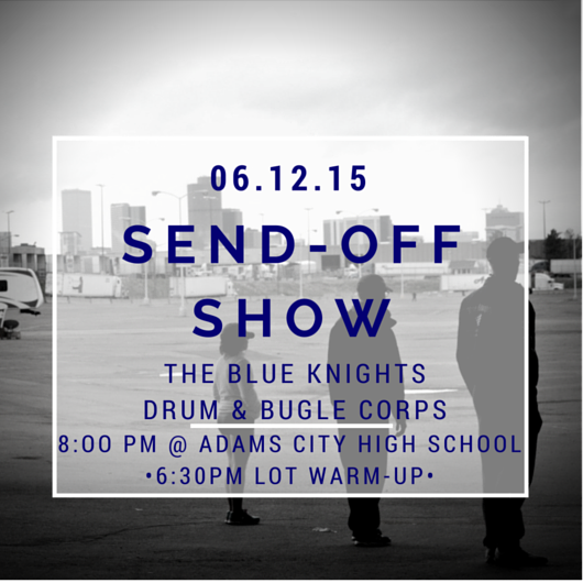 Join us on Friday, June 12th, to get a first look at the 2015 program, “Because…” The corps will be suiting up for a 8:00 pm performance at the stadium at Adams City High School for one last “home” performance before heading out on their journey across the country. Warm-up “in the lot” will begin at 6:30pm for all sections.