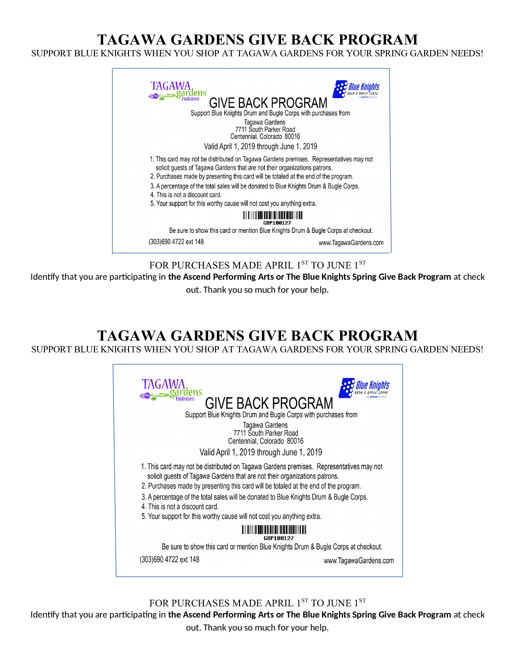 Every time you shop at Tagawa Gardens between April 1st and June 1st, 2019 and identify that you are participating in the Ascend Performing Arts or the Blue Knights Drum & Bugle Corps Spring Give Back Program, a percentage of the sale will be donated to Ascend Performing Arts and the Blue Knights.