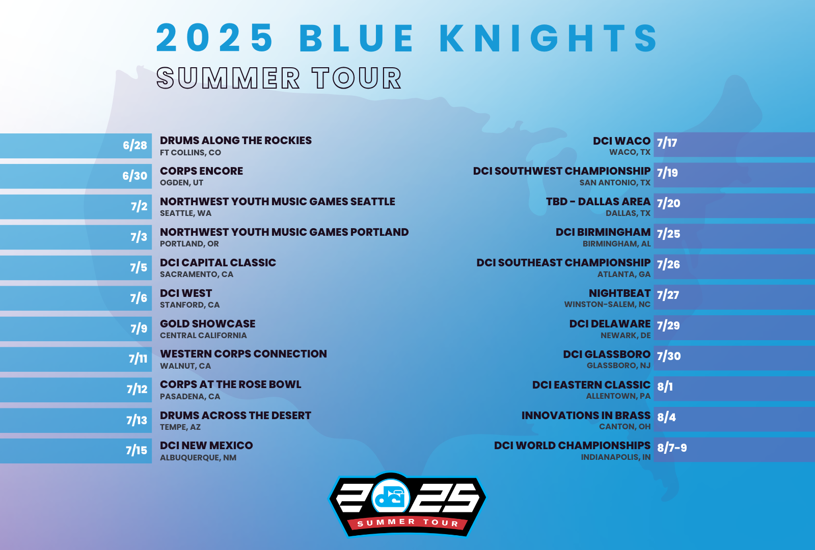 The Blue Knights 2025 tour schedule is here! We have a full season of exciting performances and we can’t wait to get back on the field for our audiences this summer. You can see the full season schedule, along with important ticket details and location information at dci.fan/BlueKnights25